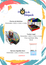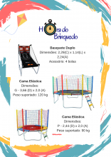 Diversão pra toda hora e lugar, temos cama elástica (2,44 e 3,66), piscina de bolinhas (2x2), tombo legal, basquete duplo eletrônico, corrida maluca (inflável), castelinho pula-pula com escorregador e barraca de algodão doce. Locações por 5horas já incluso monitor, temos combos promocionais. Venha conhecer nossa página no Facebook e saber um pouco mais do nosso trabalho.
